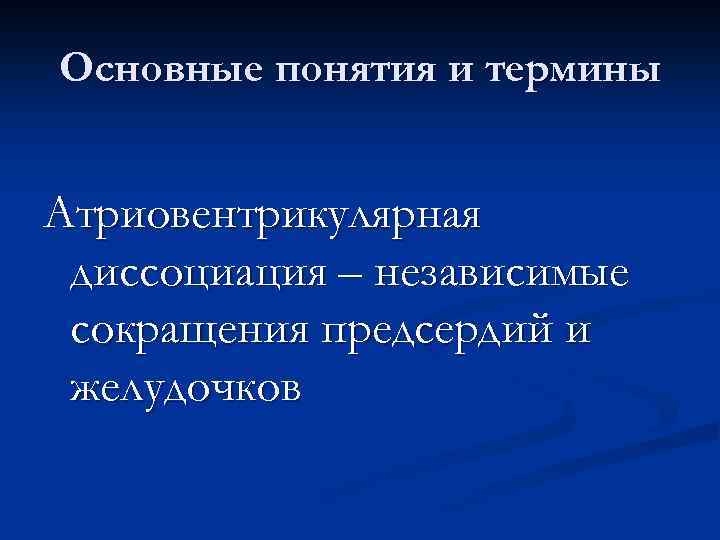 Основные понятия и термины Атриовентрикулярная диссоциация – независимые сокращения предсердий и желудочков