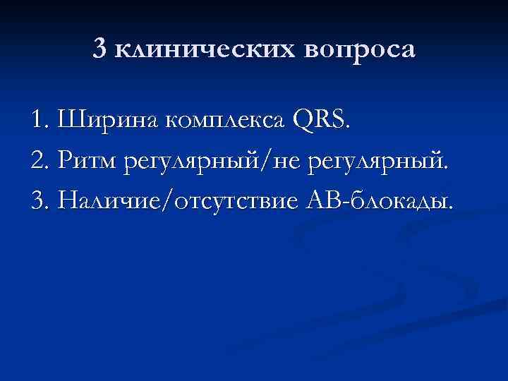 3 клинических вопроса 1. Ширина комплекса QRS. 2. Ритм регулярный/не регулярный. 3. Наличие/отсутствие АВ-блокады.