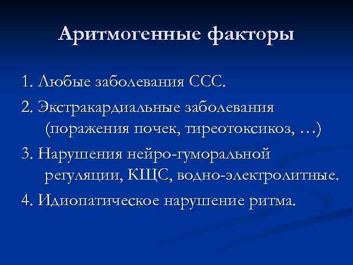 Аритмогенные факторы 1. Любые заболевания ССС. 2. Экстракардиальные заболевания (поражения почек, тиреотоксикоз, …) 3. Нарушения нейро-гуморальной регуляции, КЩС, водно-электролитные. 4. Идиопатическое нарушение ритма.