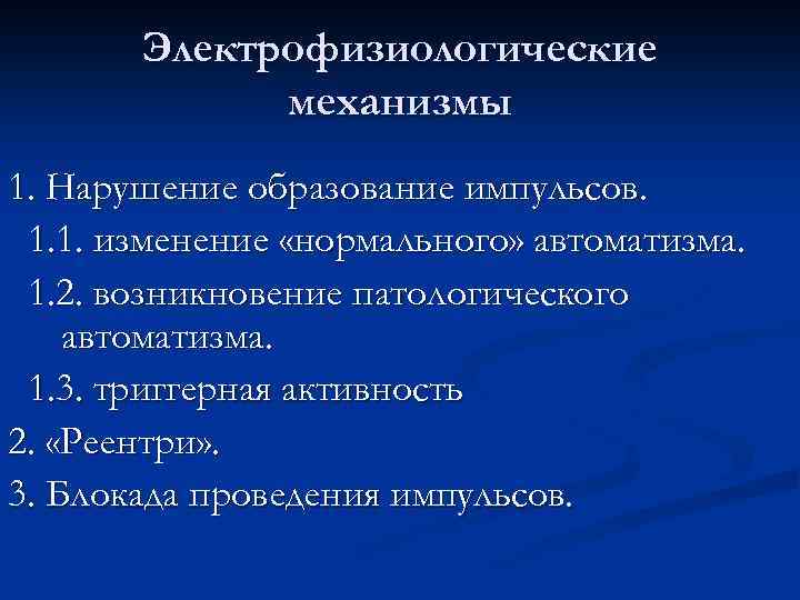 Электрофизиологические механизмы 1. Нарушение образование импульсов. 1. 1. изменение «нормального» автоматизма. 1. 2. возникновение патологического автоматизма. 1. 3. триггерная активность 2. «Реентри» . 3. Блокада проведения импульсов.