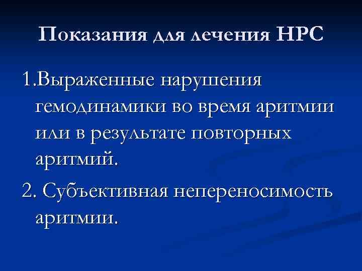 Показания для лечения НРС 1. Выраженные нарушения гемодинамики во время аритмии или в результате повторных аритмий. 2. Субъективная непереносимость аритмии.