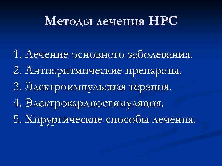Методы лечения НРС 1. Лечение основного заболевания. 2. Антиаритмические препараты. 3. Электроимпульсная терапия. 4. Электрокардиостимуляция. 5. Хирургические способы лечения.