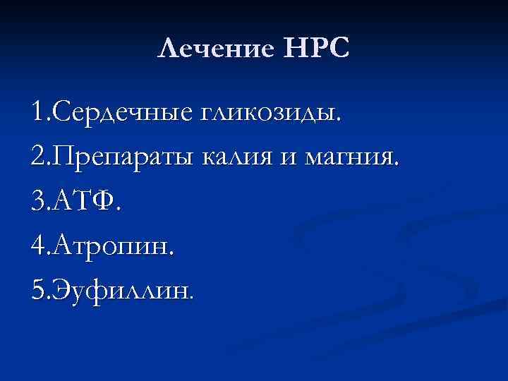 Лечение НРС 1. Сердечные гликозиды. 2. Препараты калия и магния. 3. АТФ. 4. Атропин. 5. Эуфиллин.
