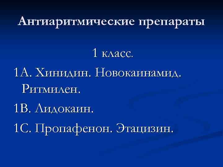 Антиаритмические препараты 1 класс. 1 А. Хинидин. Новокаинамид. Ритмилен. 1 В. Лидокаин. 1 С. Пропафенон. Этацизин.