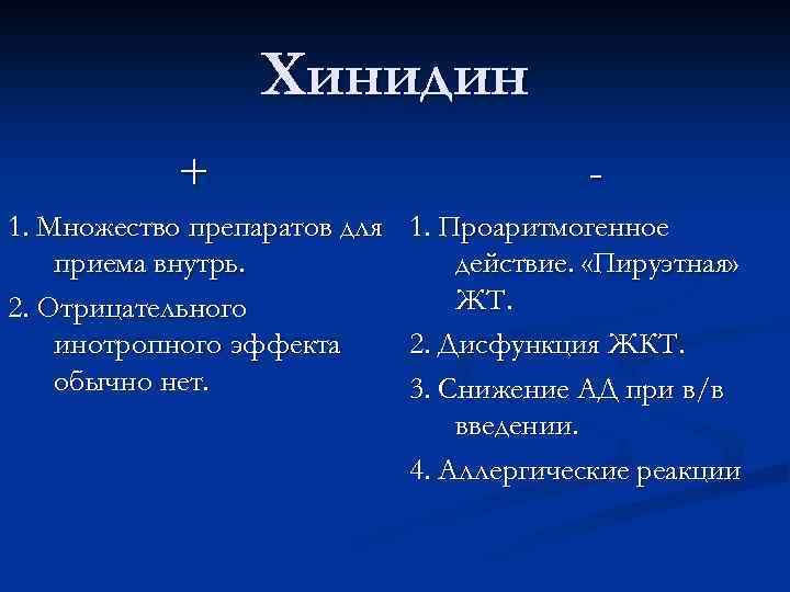Хинидин + - 1. Множество препаратов для 1. Проаритмогенное приема внутрь. действие. «Пируэтная» ЖТ. 2. Отрицательного инотропного эффекта 2. Дисфункция ЖКТ. обычно нет. 3. Снижение АД при в/в введении. 4. Аллергические реакции