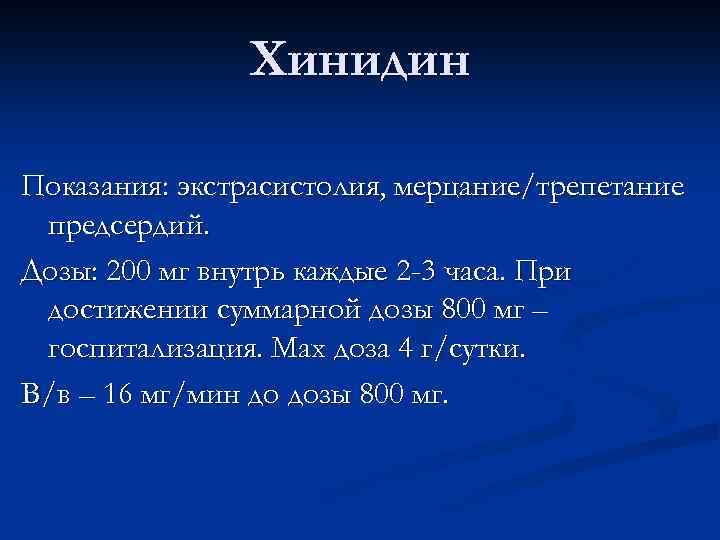 Хинидин Показания: экстрасистолия, мерцание/трепетание предсердий. Дозы: 200 мг внутрь каждые 2 -3 часа. При достижении суммарной дозы 800 мг – госпитализация. Мах доза 4 г/сутки. В/в – 16 мг/мин до дозы 800 мг.