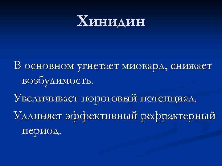 Хинидин В основном угнетает миокард, снижает возбудимость. Увеличивает пороговый потенциал. Удлиняет эффективный рефрактерный период.