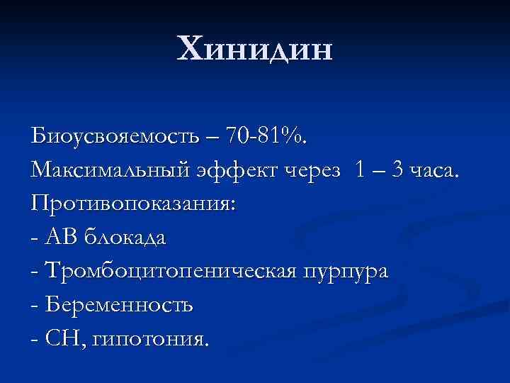 Хинидин Биоусвояемость – 70 -81%. Максимальный эффект через 1 – 3 часа. Противопоказания: - АВ блокада - Тромбоцитопеническая пурпура - Беременность - СН, гипотония.