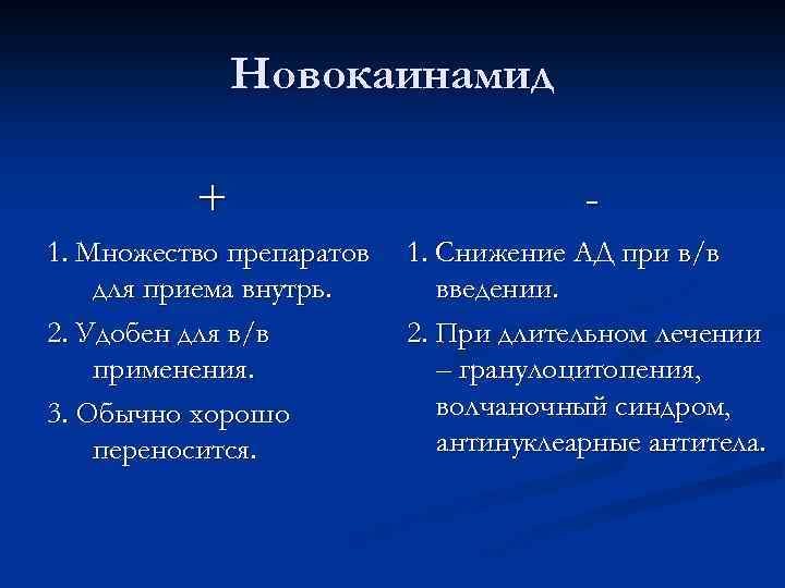 Новокаинамид + - 1. Множество препаратов для приема внутрь. 2. Удобен для в/в применения. 3. Обычно хорошо переносится. 1. Снижение АД при в/в введении. 2. При длительном лечении – гранулоцитопения, волчаночный синдром, антинуклеарные антитела.