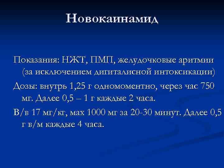 Новокаинамид Показания: НЖТ, ПМП, желудочковые аритмии (за исключением дигиталисной интоксикации) Дозы: внутрь 1, 25 г одномоментно, через час 750 мг. Далее 0, 5 – 1 г каждые 2 часа. В/в 17 мг/кг, мах 1000 мг за 20 -30 минут. Далее 0, 5 г в/м каждые 4 часа.