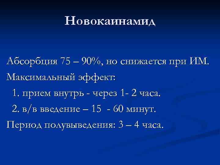 Новокаинамид Абсорбция 75 – 90%, но снижается при ИМ. Максимальный эффект: 1. прием внутрь - через 1 - 2 часа. 2. в/в введение – 15 - 60 минут. Период полувыведения: 3 – 4 часа.