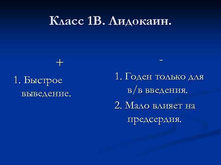 Класс 1 В. Лидокаин. + 1. Быстрое выведение. 1. Годен только для в/в введения. 2. Мало влияет на предсердия.