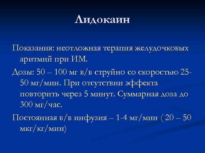 Лидокаин Показания: неотложная терапия желудочковых аритмий при ИМ. Дозы: 50 – 100 мг в/в струйно со скоростью 2550 мг/мин. При отсутствии эффекта повторить через 5 минут. Суммарная доза до 300 мг/час. Постоянная в/в инфузия – 1 -4 мг/мин ( 20 – 50 мкг/кг/мин)