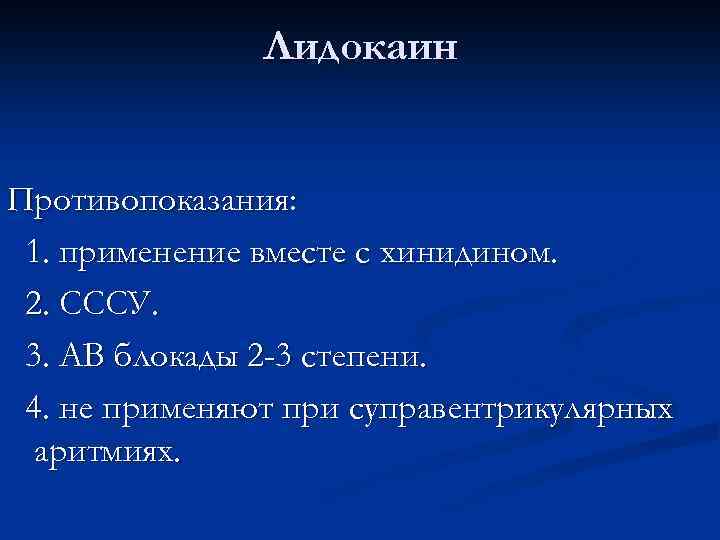 Лидокаин Противопоказания: 1. применение вместе с хинидином. 2. СССУ. 3. АВ блокады 2 -3 степени. 4. не применяют при суправентрикулярных аритмиях.