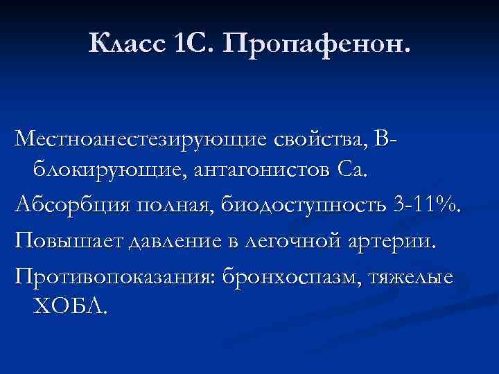 Класс 1 С. Пропафенон. Местноанестезирующие свойства, Вблокирующие, антагонистов Са. Абсорбция полная, биодоступность 3 -11%. Повышает давление в легочной артерии. Противопоказания: бронхоспазм, тяжелые ХОБЛ.