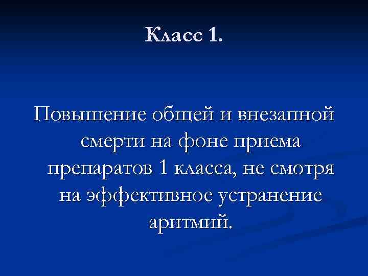 Класс 1. Повышение общей и внезапной смерти на фоне приема препаратов 1 класса, не смотря на эффективное устранение аритмий.