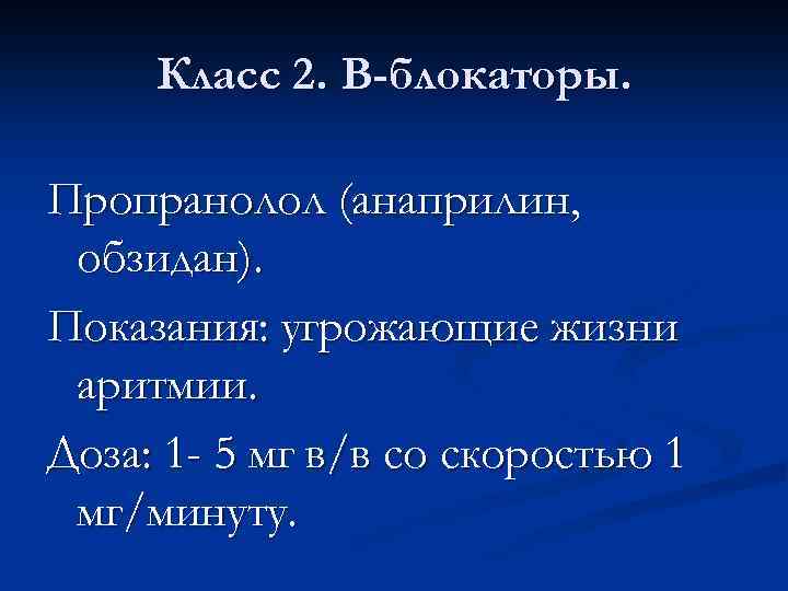 Класс 2. В-блокаторы. Пропранолол (анаприлин, обзидан). Показания: угрожающие жизни аритмии. Доза: 1 - 5 мг в/в со скоростью 1 мг/минуту.