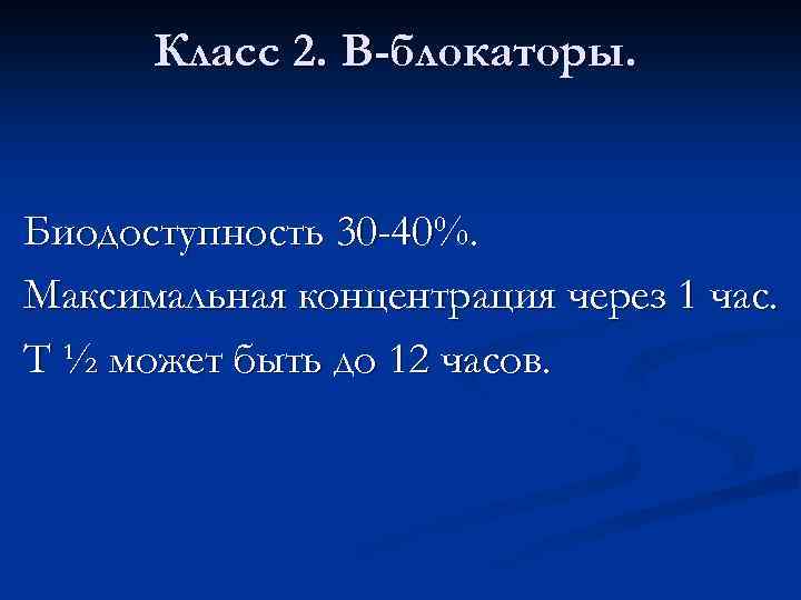 Класс 2. В-блокаторы. Биодоступность 30 -40%. Максимальная концентрация через 1 час. Т ½ может быть до 12 часов.