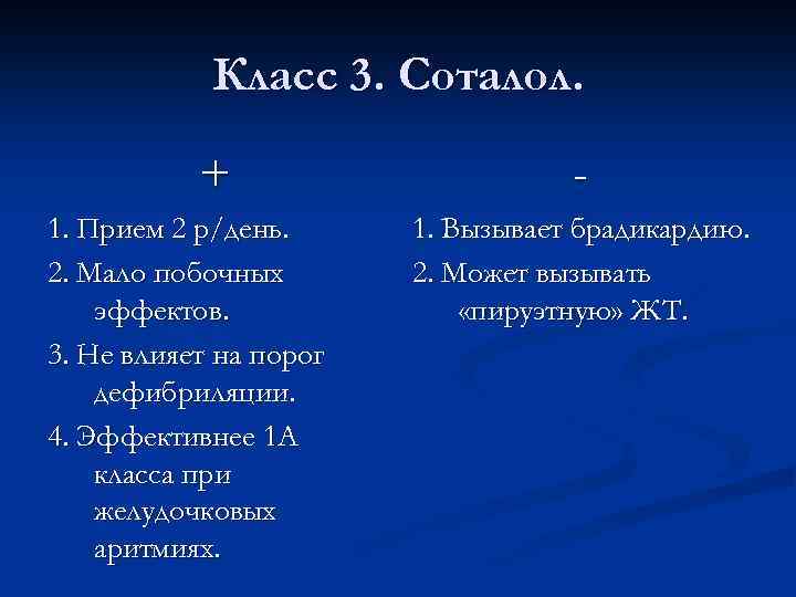 Класс 3. Соталол. + 1. Прием 2 р/день. 2. Мало побочных эффектов. 3. Не влияет на порог дефибриляции. 4. Эффективнее 1 А класса при желудочковых аритмиях. 1. Вызывает брадикардию. 2. Может вызывать «пируэтную» ЖТ.