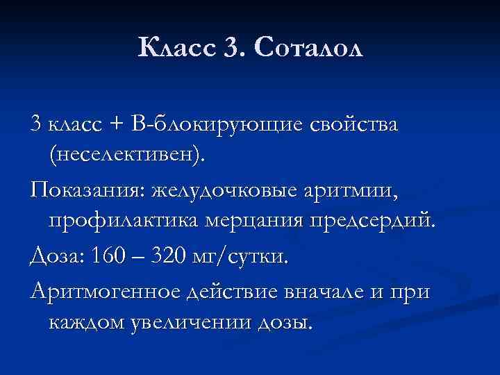 Класс 3. Соталол 3 класс + В-блокирующие свойства (неселективен). Показания: желудочковые аритмии, профилактика мерцания предсердий. Доза: 160 – 320 мг/сутки. Аритмогенное действие вначале и при каждом увеличении дозы.