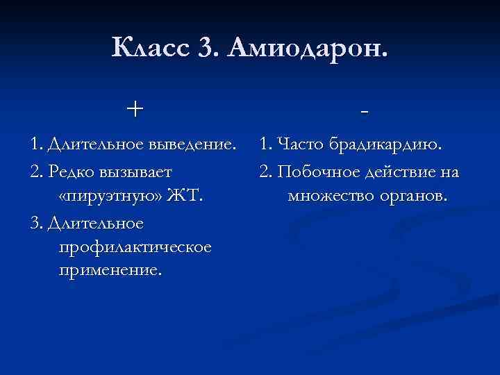 Класс 3. Амиодарон. + - 1. Длительное выведение. 2. Редко вызывает «пируэтную» ЖТ. 3. Длительное профилактическое применение. 1. Часто брадикардию. 2. Побочное действие на множество органов.