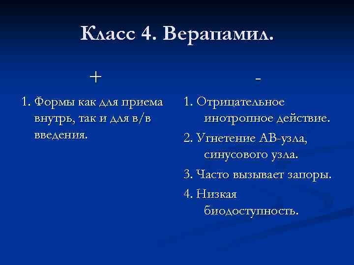 Класс 4. Верапамил. + - 1. Формы как для приема внутрь, так и для в/в введения. 1. Отрицательное инотропное действие. 2. Угнетение АВ-узла, синусового узла. 3. Часто вызывает запоры. 4. Низкая биодоступность.