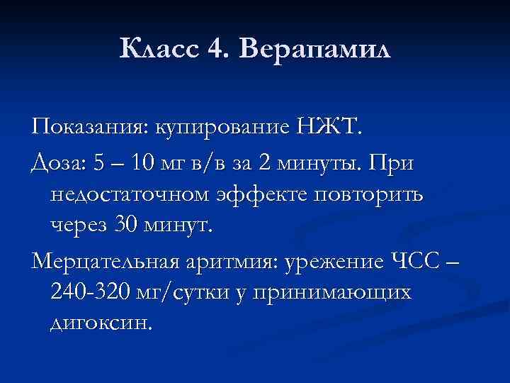 Класс 4. Верапамил Показания: купирование НЖТ. Доза: 5 – 10 мг в/в за 2 минуты. При недостаточном эффекте повторить через 30 минут. Мерцательная аритмия: урежение ЧСС – 240 -320 мг/сутки у принимающих дигоксин.