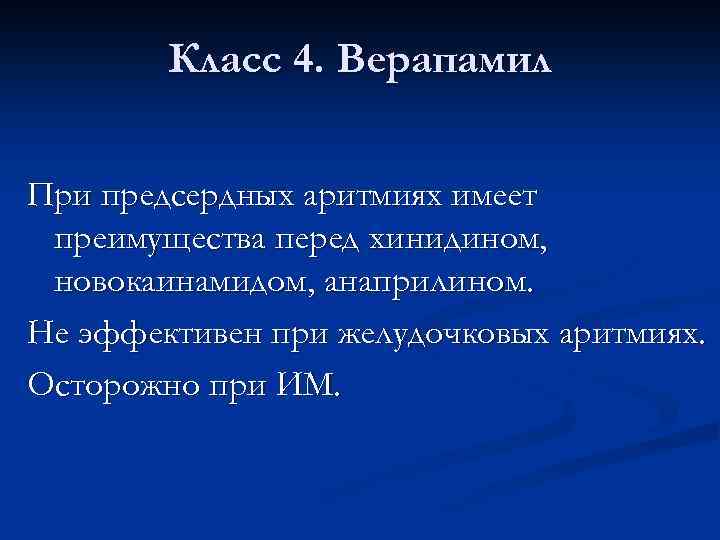Класс 4. Верапамил При предсердных аритмиях имеет преимущества перед хинидином, новокаинамидом, анаприлином. Не эффективен при желудочковых аритмиях. Осторожно при ИМ.