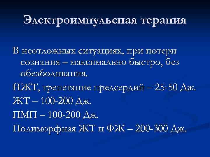 Электроимпульсная терапия В неотложных ситуациях, при потери сознания – максимально быстро, без обезболивания. НЖТ, трепетание предсердий – 25 -50 Дж. ЖТ – 100 -200 Дж. ПМП – 100 -200 Дж. Полиморфная ЖТ и ФЖ – 200 -300 Дж.