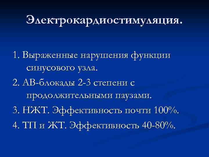 Электрокардиостимуляция. 1. Выраженные нарушения функции синусового узла. 2. АВ-блокады 2 -3 степени с продолжительными паузами. 3. НЖТ. Эффективность почти 100%. 4. ТП и ЖТ. Эффективность 40 -80%.