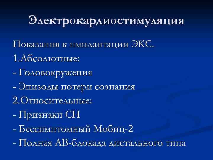 Электрокардиостимуляция Показания к имплантации ЭКС. 1. Абсолютные: - Головокружения - Эпизоды потери сознания 2. Относительные: - Признаки СН - Бессимптомный Мобиц-2 - Полная АВ-блокада дистального типа