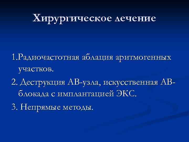 Хирургическое лечение 1. Радиочастотная аблация аритмогенных участков. 2. Деструкция АВ-узла, искусственная АВблокада с имплантацией ЭКС. 3. Непрямые методы.
