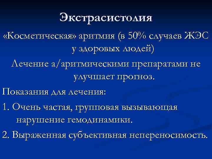 Экстрасистолия «Косметическая» аритмия (в 50% случаев ЖЭС у здоровых людей) Лечение а/аритмическими препаратами не улучшает прогноз. Показания для лечения: 1. Очень частая, групповая вызывающая нарушение гемодинамики. 2. Выраженная субъективная непереносимость.