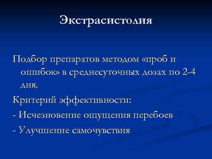 Экстрасистолия Подбор препаратов методом «проб и ошибок» в среднесуточных дозах по 2 -4 дня. Критерий эффективности: - Исчезновение ощущения перебоев - Улучшение самочувствия