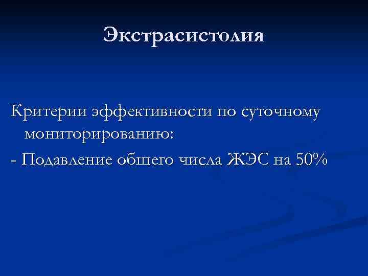 Экстрасистолия Критерии эффективности по суточному мониторированию: - Подавление общего числа ЖЭС на 50%