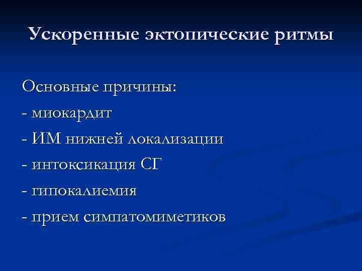 Ускоренные эктопические ритмы Основные причины: - миокардит - ИМ нижней локализации - интоксикация СГ - гипокалиемия - прием симпатомиметиков
