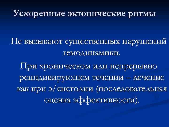 Ускоренные эктопические ритмы Не вызывают существенных нарушений гемодинамики. При хроническом или непрерывно рецидивирующем течении – лечение как при э/систолии (последовательная оценка эффективности).