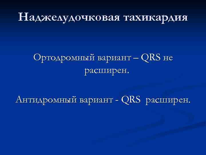 Наджелудочковая тахикардия Ортодромный вариант – QRS не расширен. Антидромный вариант - QRS расширен.