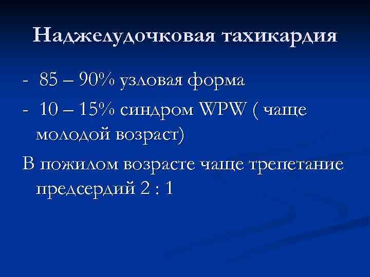 Наджелудочковая тахикардия - 85 – 90% узловая форма - 10 – 15% синдром WPW ( чаще молодой возраст) В пожилом возрасте чаще трепетание предсердий 2 : 1