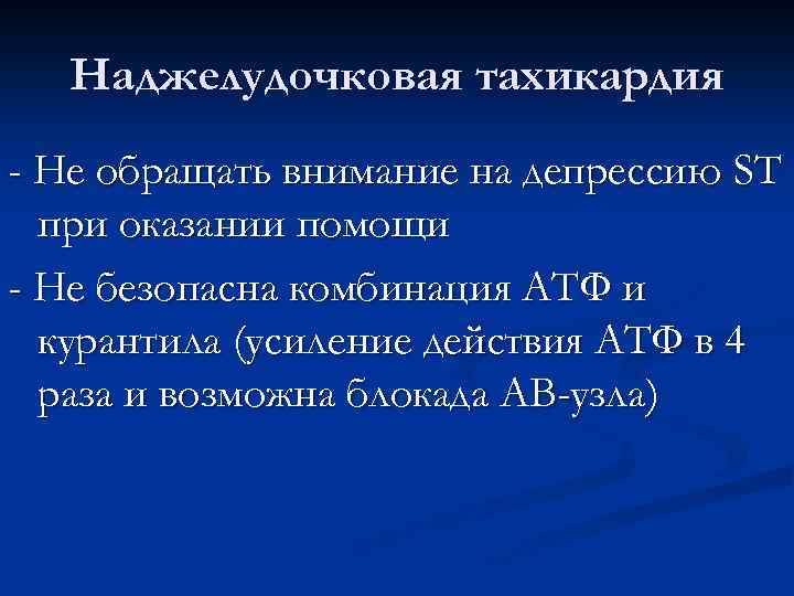 Наджелудочковая тахикардия - Не обращать внимание на депрессию ST при оказании помощи - Не безопасна комбинация АТФ и курантила (усиление действия АТФ в 4 раза и возможна блокада АВ-узла)