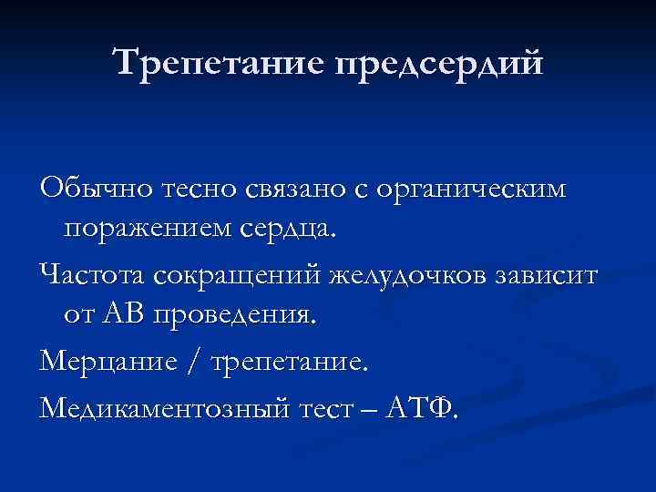 Трепетание предсердий Обычно тесно связано с органическим поражением сердца. Частота сокращений желудочков зависит от АВ проведения. Мерцание / трепетание. Медикаментозный тест – АТФ.