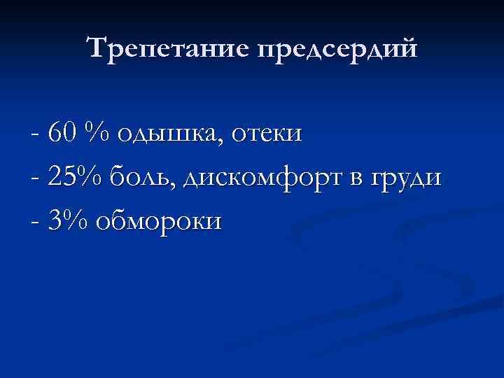 Трепетание предсердий - 60 % одышка, отеки - 25% боль, дискомфорт в груди - 3% обмороки