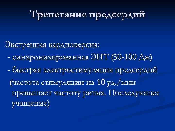 Трепетание предсердий Экстренная кардиоверсия: - синхронизированная ЭИТ (50 -100 Дж) - быстрая электростимуляция предсердий (частота стимуляции на 10 уд. /мин превышает частоту ритма. Последующее учащение)