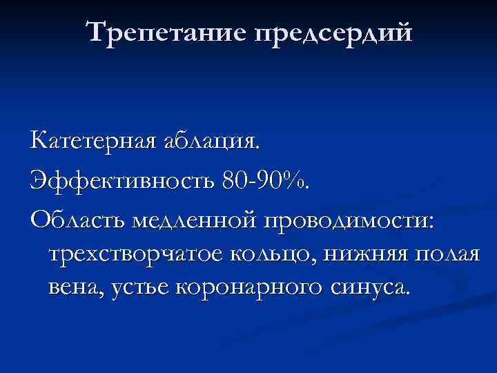 Трепетание предсердий Катетерная аблация. Эффективность 80 -90%. Область медленной проводимости: трехстворчатое кольцо, нижняя полая вена, устье коронарного синуса.