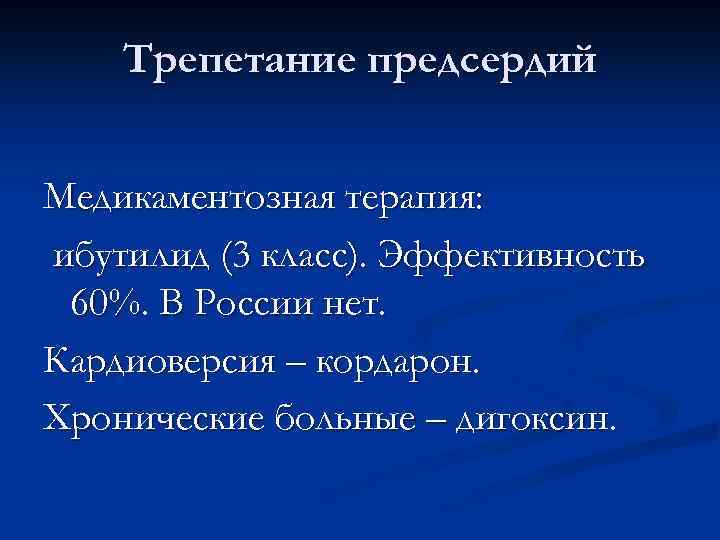 Трепетание предсердий Медикаментозная терапия: ибутилид (3 класс). Эффективность 60%. В России нет. Кардиоверсия – кордарон. Хронические больные – дигоксин.