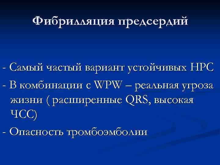 Фибрилляция предсердий - Самый частый вариант устойчивых НРС - В комбинации с WPW – реальная угроза жизни ( расширенные QRS, высокая ЧСС) - Опасность тромбоэмболии