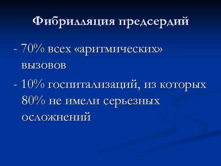 Фибрилляция предсердий - 70% всех «аритмических» вызовов - 10% госпитализаций, из которых 80% не имели серьезных осложнений
