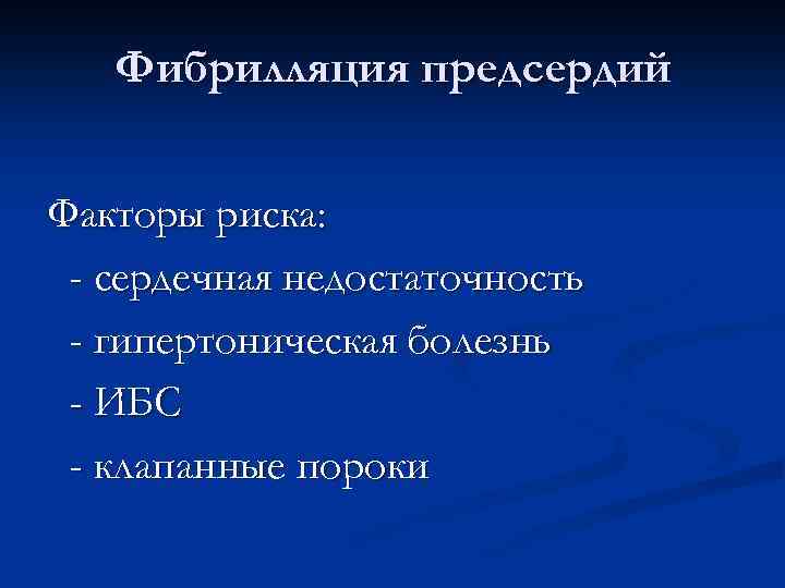 Фибрилляция предсердий Факторы риска: - сердечная недостаточность - гипертоническая болезнь - ИБС - клапанные пороки