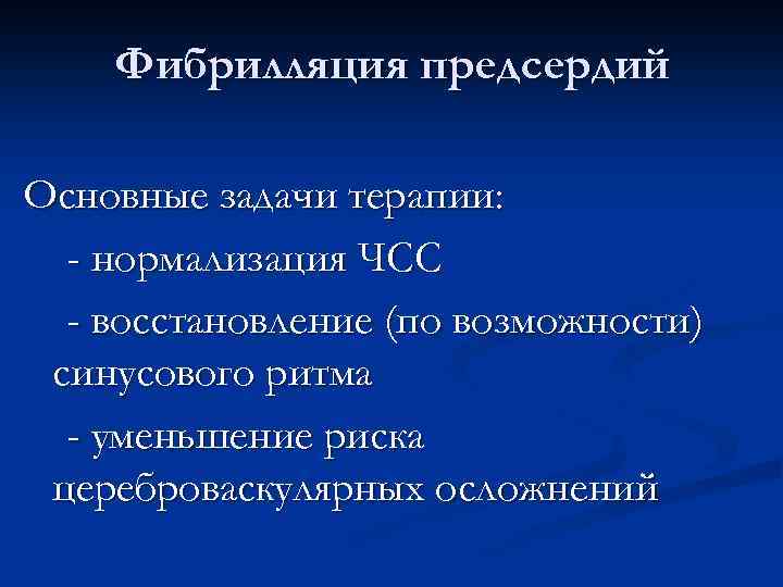 Фибрилляция предсердий Основные задачи терапии: - нормализация ЧСС - восстановление (по возможности) синусового ритма - уменьшение риска цереброваскулярных осложнений