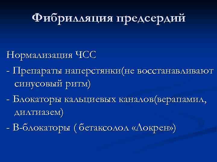 Фибрилляция предсердий Нормализация ЧСС - Препараты наперстянки(не восстанавливают синусовый ритм) - Блокаторы кальциевых каналов(верапамил, дилтиазем) - В-блокаторы ( бетаксолол «Локрен» )